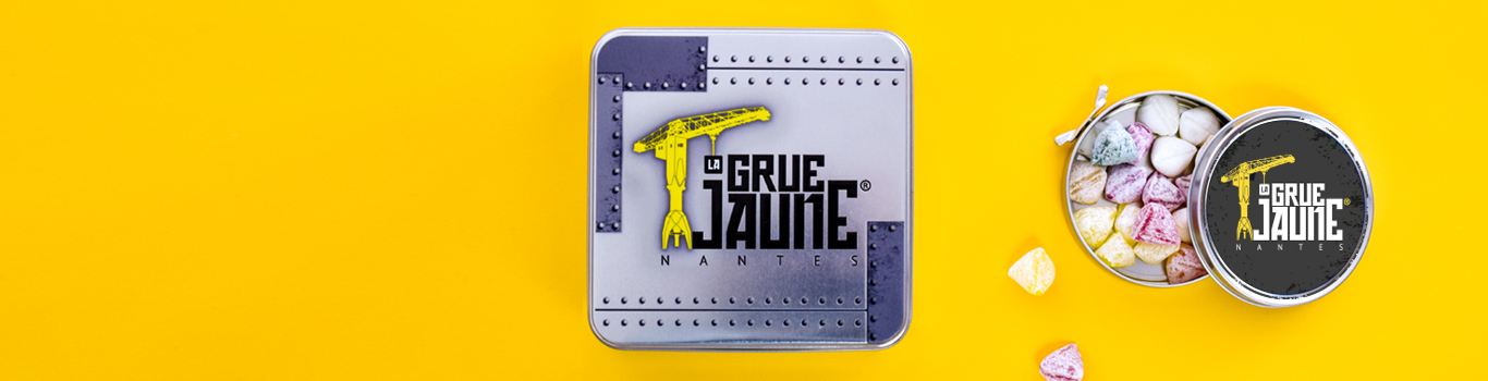La première idée, un petit cadeau souvenir en métal pour rappeler le matériau de la grue jaune, véritable symbole de la ville de Nantes. Imprimée en petite série, 100 exemplaires minimum, Cédric a choisi notre boîte cirage pour y imprimer son logo.